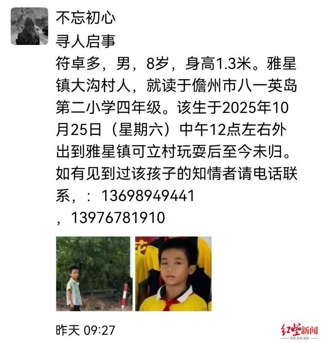 10月28日,红星新闻记者从海南省儋州市亚星镇政府及失踪儿童家属处获悉,亚星镇一对14岁和8岁的表弟已失踪80多个小时,仍未找到。亚兴镇政府工作人员告诉红星新闻,当地警方已经介入,目前还没有两名失踪人员的消息。失踪人员截图,是付卓多父亲的朋友。据了解,失踪者是其表弟付卓多,男,8岁,身高1.3米;表弟付喜朵,14岁,亚兴镇大沟村人。弟弟付卓多在儋州市八一营道第二小学读四年级。 10月25日星期六中午12点左右,两个表弟到亚兴镇科利村出去玩,至今没有回来。付卓多的父亲告诉红星新闻记者,失踪的孩子没有亲人。胆电话或电话手表。目前尚不清楚这两个孩子失踪的去向。他们可能在表兄弟、同学或朋友的家里玩耍。 “我们通知了所有的村庄,村长说如果村民看到这个男孩就打电话给他们。”付卓多的父亲说道。 “我表弟付熙朵不上学了,家里人也不关心他了。”付卓朵的父亲告诉红星新闻记者,14岁的付喜朵有时只出去一两个月就回家。事发后,家长前往派出所报警。红星新闻记者拨打亚星派出所值班电话,得到的答复是“该事件已由另一支队报案”。失踪者付卓多照片来自家人朋友圈 失踪者付喜多照片由采访者28日下午提供,儋州市亚兴镇政府工作人员表示,事情发生在10月25日(周六),且年龄较大孩子(付熙朵)带着小孩子(付卓朵)。第二天孩子没有回家,家长就到派出所报了警。派出所已按照规定对孩子进行了登记,并通过渠道发布了相关失踪人员信息。当地干部、学校教师等也都进行了传承。付卓多的父亲表示,两个孩子已经失踪80多个小时,但一直没有找到专业救援队去寻找他们。 “如果孩子失踪一天,我们真的很担心。”红星新闻记者、编辑罗敏、审稿人欧鹏、高胜祥