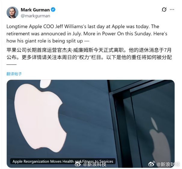 △点击上图查看彭博社马克·古尔曼今天(11月15日)在X平台发推文的详细内容,报道苹果前首席运营官杰夫·威廉姆斯今天正式退休。威廉姆斯自 2010 年起担任苹果首席运营官。他的职位已移交给萨比赫·汗 (Sabih Khan),萨比赫·汗最近清除了他之前负责的关键业务问题的所有权。除了担任首席运营官之外,Williams 还负责公司的客户服务和支持、设计团队、Apple Watch 软件和硬件工程以及整体健康计划。在他退休后,苹果重新调整了这些广泛的职责。苹果首席执行官蒂姆·库克高度评价了威廉姆斯,他表示:“没有杰夫,苹果就不会是今天的样子。”库克强调,hinWilliams 不仅帮助苹果打造了全球最受尊敬的供应链之一,还领导了 Apple Watch 的推出和开发,构想了公司的健康战略,并领导了 Apple Watch 的推出和开发。充满智慧和热情的设计团队。库克表示,威廉姆斯最重要的遗产是他创建的非凡团队。城石互动·城市快报综合新浪财经编辑潘莉点评罗毅王晨宇