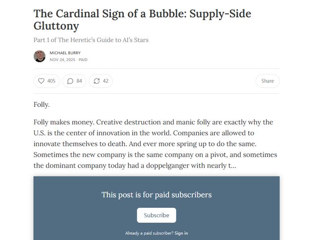 “这一次也不例外,无论有多少人试图证明这一点。再说一遍,在一切事物的中间都有一个思科,它为一切事物提供‘镐和铲子’,并伴随着远大的愿景。它的名字就是英伟达。”在经历了基金解约传闻和“做空AI价值被媒体放大一百倍”的告别后,电影《大空头》原型人物迈克尔·伯里在当地时间11月24日履行了自己的诺言,准时“回归”。这一次,他并没有像传闻中那样拿着大期权做空市场。相反,他选择通过他的第一篇专栏《泡沫的主要标志:供给侧贪婪》来表达他对“做空人工智能”的看法。在这篇文章中,Burry正式向当下的AI热潮宣战,而ng风暴的中心就是nvidia。他说英伟达是年度思科。核心争论:Nvidia 是年度思科。伯里在文章中对最近的主流进行了针锋相对的反驳认为“科技巨头利润丰厚,因此不存在泡沫”。他引用了1999年互联网泡沫顶峰时期的数据,指出当年的繁荣也是由高利润公司推动的,而不仅仅是连盈利都没有的小网站。他在文章中写道:“1999年强劲的纳斯达克指数并不是像人们想象的那样是由不盈利的网络公司推动的,而是由高利润的大盘股推动进入新世纪的,其中包括当时的‘四骑士’——微软、英特尔、戴尔和思科……”伯里相信历史正在运行。当前的人工智能热潮由“五奥斯彭骑士”——微软、谷歌、Meta、亚马逊和甲骨文,以及 OpenAI 等初创公司引领。这些公司承诺在未来三年内投资近3万亿美元用于人工智能基础设施。在这一切之中,伯里看到了思科的影子——作为当时网络建设基础设施提供商,思科的股价下跌了泡沫破灭后下降了75%以上。他在文章中明确表示:“再说一遍,一切事物中间都有一个思科,为一切提供‘镐和铲子’,并结合了伟大的愿景。它的名字就是nvidia。”泡沫本质:供给侧“暴饮暴食” 在此前11月11日的预告中,伯里指责科技公司通过延长亏损期限来增加利润。 《华尔街日报》注意到,11月11日,伯里在社交媒体上指出,AI芯片等设备的实际寿命只有2-3年,但一些公司将损耗周期延长至6年。他预测,从 2026 年到 2028 年,大型科技公司将因低估消耗而损失 1760 亿美元的收入。他特别指出,Oracle 2028 年的收入可能被高估了 26.9%,而 Meta 的收入可能被高估了 20.8%。同时,其承诺将在11月25日透露更多细节。在最新发布的中文章中,他进一步深化了这一观点,将其定义为“供给侧贪婪”。伯里在文章中指出,当前人工智能热潮的主要问题是“灾难性的供应过剩和需求远远不够”。他认为,科技巨头正在进行一种不可持续的资本支出,投入天文数字用于开发MGA数据中心和购买芯片,但当前应用产生的实际收入远远无法覆盖这些成本。伯里警告投资者不要被所谓的“这次不一样”所愚弄。他在文章中写道:“无论有多少人试图证明,这一次也不例外。”对手回应:黄仁勋眼中“不一样的景象”。面对伯里的持续质疑和市场关于“AI泡沫”的讨论,处于风暴中心的英伟达并没有表现出示弱。据彭博社报道,NVIDIA 最近向华尔街分析师发送了一份备忘录反驳巴里早些时候对其解散和收购问题的指控。 NVIDIA CEO黄仁勋在上周财报发布后也直接回应了“泡沫论”:“关于AI泡沫有很多讨论,”黄仁勋表示,“但从我们的角度来看,我们看到了一些不同的东西。”同样,伯里也坚决看空AI。尽管Nvidia在他看来很重要,但他仍然坚持要宣布。 《解放》:从基金经理到分析师的转变。 《火药》的深度分析发表在巴里新推出的付费专栏《被解救的卡桑德拉》(Cassandra Unchained)中,年费高达379美元。《泡沫的关键迹象:供给侧的暴食》是该专栏的第一篇文章。在经历了此前基金被取消的传闻后,伯里在专栏的“关于”页面中解释了自己放弃基金管理、转而做全职作家的原因。他说,过去在管理客户资金时:pondo的专业管理伴随着监管和合规限制,这确实“有效地压制”了我表达自己的能力。这些限制意味着我只能公开分享隐藏的片段。现在,他说:“结束了。”正如沃伦·巴菲特在国会听证会上称她为“卡桑德拉”一样,她目前的状态是“卡桑德拉未被注意到”,这表明她将毫无保留地分享她对市场泡沫的观察。 “卡珊德拉”指的是希腊神话中的女祭司,她的预言准确但不被相信。 《华尔街日报》撰文称,今年 11 月,媒体曝出“他在 AI 负责人的轮换上押注过大。后来,Michael Burry 亲自否认了这一传闻,称媒体报道的“Nvidia 和 Palantir 轮换 9.12 亿美元”严重夸大,与真正的投资是 920 万美元——相差一百倍。Burry 表示媒体误认为是SEC 披露的名义风险敞口为基金规模。更引人注目的是,他还悄悄取消了对基金中基金的管理,并宣布将于11月25日推出新项目。 尾声:不受欢迎的先知?需要指出的是,就连巴里此前也被媒体误传持有“近10亿美元”的空头仓位(实际上其面值为920万美元,且部分仓位已平仓)。 ),但这并没有改变他看空AI宏观逻辑的决心。在第一篇文章的末尾,巴里引用了巴菲特老搭档查理·芒格的一句话,这似乎是他当前论文的脚注:“如果我到处吹气球,你就不会成为房间里最受欢迎的人。你到处吹爆很多气球,你就不会成为房间里最受欢迎的人。”