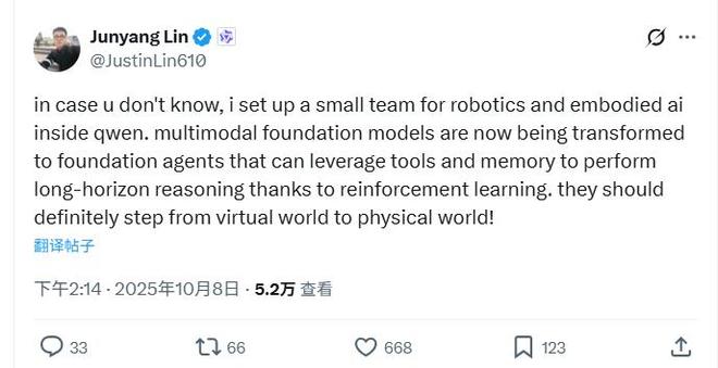 阿里巴巴集团内部成立机器人团队,正式加入全球人工智能实体产品巨头技术竞赛。 10月8日星期三,阿里巴巴统一千文技术总监林俊阳周三在社交媒体X上透露,阿里巴巴创立了一个“机器人,并包含了AI团队”。它标志着阿里巴巴从AI软件到硬件应用的战略延伸。此举正值全球科技巨头投资机器人领域之际。同样在周三,日本软银集团宣布收购ABB工业机器人业务,进一步强化其在“物理AI”领域的布局。阿里云最近首次部署了体现智能,并于上个月向中国机器人初创企业X Square Robot投资1.4亿美元。两周前的2025云栖大会上,阿里巴巴CEO吴永明表示,AI全球投资总额将未来五年加速4万亿美元,阿里巴巴应该继续下去。除了2月宣布未来三年投入3800亿元用于云和人工智能硬件基础设施外,阿里巴巴还计划追加资金投入。多模态基础模型转变为主要代理,应该走向现实世界。除了透露成立“机器人和具身AI小组”外,林俊阳周三还在X平台发文表示:“多模态基础模型现在改造成一个大智能体,可以通过学习强化,利用工具和内存进行长期推理。”他强调,这些应用应该“应该从虚拟世界走向现实世界。”作为统一钱文的技术负责人,林俊阳 Junyang早些时候参与了可以处理声音、图像和文本输入的多模态模型的开发。在大型模型和人工智能技术在实体产品上的应用机器人,他们寻求在快速增长的人工智能市场中占据一席之地。阿里云自变量机器人这标志着阿里云在实体智能领域的首次拓展。独立可变机器人首席运营官杨前透露,公司成立两年多以来,已完成八次融资,融资金额合计约2.8亿美元。自变量机器人走的是多元化路线,看重软件和算法。 9月8日,开源体现智能主模型“Wall-Ok”和机器人Quanta X2。该公司表示,该机器人可以连接拖把头进行360度清洁,并配备可以感受细微压力变化的机械手,更接近人类功能。自变量机器人表示,从来不是面向大众市场的NSAD产品,具体价格将根据情况确定机器人使用场景。据 Humanoid Guide 公司称,这款人形机器人的售价为 80,000 美元。自变量机器人目前正在学校、酒店、护理护士等机构销售产品以产生收入,并计划明年开始准备IPO。该公司希望“机器人管家”五年后成为现实,但杨前坦言,机器人的AI技术还停留在聊天生成或代码等领域。全球巨头都在争夺机器人赛道。阿里巴巴的机器人布局正值巨无霸科技的巨无霸技术投入不断加大的时候。而市场通常预期,生成式AI与机器人的融合将彻底改变。 人机接触。阿里巴巴的入驻将为这一竞争领域增添新的变数。在今年6月的公司股东年会上,英伟达首席执行官黄詹勋表示,AI和机器人是英伟达的两大技术诺学机会,将为公司带来“万亿美元”的长期增长机会。黄仁勋当时表示,自动驾驶汽车将是机器人技术的第一个主要商业应用。在应用领域,英伟达的目标是数十亿个机器人、数亿辆自行驾驶的汽车、数十万个机器人工厂都由英伟达的技术驱动。软银集团周三宣布将以54亿美元现金收购瑞士Indu旗下机器人业务机器人巨头ABB。这是软银在“物理AI”领域的主要战略布局。软银董事长孙正义表示,此举旨在“纳入人工智能和机器人技术”,打造“软银的下一个边界”。ABB的机器人部门到2024年将实现收入23亿美元,在全球拥有约7000名员工,到2050年将达到万亿美元。巨大的市场潜力吸引了包括政府在内的大量资本流向。汇出的资金。