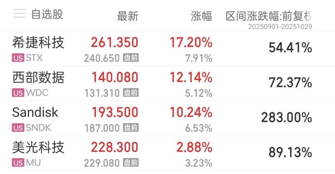 当地时间10月29日,美国股市存储板块继续上涨。截至发稿,希捷科技涨17.2%,西部数据涨超12%,闪迪涨超10%,美光科技涨近3%。值得注意的是,美国股市存储板块近两个月涨幅缓慢。希捷科技涨54.41%,西部数据涨72.37%,美光科技涨89.13%,闪迪涨283%。消息中,近期存储产品价格出现惊人涨幅。据中国蓝色新闻报道,在浙江杭州,近一个月内存模组价格翻了一番。有商家表示,原本200多元的记忆棒现在已经涨到了400元,原本1000多元的记忆棒涨到了近2000元。不少网友在社交媒体上纷纷晒出自己囤积的记忆棒。他们庆幸的是他们很早就把电脑组装起来了。 “没想到记忆棒会成为‘电子茅台’,涨幅比黄金还要快。”内存价格飞涨。据界面新闻报道,Trendforce咨询数据显示,2025年第三季度,DRAM价格较去年同期大幅上涨171.8%。如果按照全球黄金现货价格3998美元/盎司计算,这仅比年内低点1890美元上涨115%。从地区市场数据来看,10月13日至18日,DRAM方面,DDR5 16G和DDR4 16G均价较前一周分别上涨20.59%和11.11%,环比涨幅高达58.73%和43%。 DDR,代表双倍数据速率,是内存模块(动态随机存取存储器,DRAM)的主要技术标准,也是衡量内存性能的主要指标之一。存储设备可以分为两类s:一是连续数据存储(如NAND闪存,断电后数据不丢失),二是实时数据临时存储(如DRAM,需要持续供电,读写速度快)。其中,基于DRAM技术的高端品类HBM(高带宽内存)可以满足AI计算、服务器等领域“实时海量数据流”的需求。人工智能驱动的产能转移造成产品供给的结构性失衡,这是周期性价格上涨的主要逻辑。自2022年11月ChatGPT诞生引发生成式人工智能热潮并掀起全球人工智能数据生产竞赛以来,存储芯片制造商正在将更多产能转向生产HBM芯片。 Yole Group预测,主要用于GPU生产的HBM产品收入预计将增长近一倍,达到约U到 2025 年将达到 340 亿新元; HBM市场将保持33%的年复合增长率,直到2030年,其营收将超过DRAM市场总营收的50%。值得一提的是,HBM 消耗的晶圆容量是标准 DRAM 的三倍以上。 OpenAI等公司提出的每月90万片晶圆订单,相当于消耗了目前全球DRAM月产能的53%。此外,长鑫内存等中国企业在低端DRAM芯片方面的竞争日益激烈,也促使控制着全球DRAM芯片市场约70%份额的三星和韩国SK海力士加速向高端芯片转型。这些厂商从2025年初开始就在逐步调整策略,从2025年底到2026年初逐步减少甚至计划完全停止DDR4内存颗粒的生产,彻底将生产转移到生产线上。产能转向利润更高、技术更先进的DDR5、HBM等产品。这直接挤压了DDR4产能缺口,导致DDR4产量下降,市场供不应求。为了应对涨价,早在年初,不少卖家就开始大量备货,锁定价格。在华强北等电子集散地,贸易商二季度开始大规模扫货,导致民用市场区域流通量减少,涨价幅度进一步加大。 Trendforce 7月发布的报告显示,由于三大厂商产能转移以及个人电脑、服务器用DDR4和手机用LPDDR4X进入产品生命周期末期的消息,市场引发了前代产品的积极备货。另外,这也是存储行业的PE农季,现货市场供应紧缺。 2025年第三季度电视剧合约价格将上涨10%至15%,第三季度价格涨幅将达到40%至45%。存储芯片制造商赚取巨额利润。据财联社报道,韩国 KB 证券研究总监 Jeff Kim 预计,如果目前的涨势持续下去,明年非 HBM 存储芯片的营收可能会超过 HBM。据其测算,三星7月至9月的Standard Dram业务运营利润约为40%,HBM业务运营利润为60%。美光科技上个月预测,HBM 和非 HBM 业务都将在 2026 年保持健康的 mga 利润率。另一方面,芯片内存价格上涨可能会给消费电子和服务器制造商带来额外的成本压力。这些公司面临着美国关税上涨和稀土短缺造成的潜在供应链中断带来的成本增加。ges。一些公司正在承受消费者的成本压力。例如,英国个人电脑制造商Raspberry Pi本月初宣布涨价,称内存成本与一年前相比增加了近120%。其首席执行官埃本·厄普顿(Eben Upton)表示:“我们已经到了必须分担一些成本的阶段。”小米发布红米K90手机时,创始人雷军就确立了不同版本之间巨大的价格差异,增加了存储成本。小米集团合伙人兼总裁卢伟冰表示,“我们无法改变全球供应链的趋势,仓储成本上升幅度高于预期,并将继续加剧。”全球第二大存储模组厂威刚董事长陈立白此前表示,目前DRAM、NAND闪存、SSD、机械硬盘四大存储品类全面缺货、涨价的情况在他的多年时间里从未出现过。从事该行业30年。他认为,第四季度是真正的囤货起点,也是严重短缺的开始,并预测明年行业将会好转。 (免责声明:本文内容及数据仅供参考,不构成投资建议,使用前请核实。自行承担风险。)