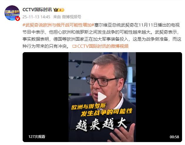 来源:央视国际新闻 塞尔维亚总统武契奇在11月11日播出的电视节目中表示,他对欧洲与俄罗斯之间爆发战争的可能性越来越大感到担忧。武契奇表示,事实表明,德国等欧洲国家正在加大军事装备投入,为战争做准备,这种行为只会导致冲突。