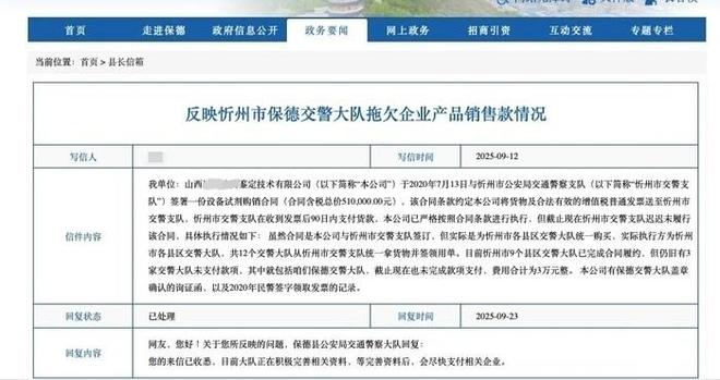 近日,有网友在山西省忻州市保德县政府官网“局长信箱”栏目留言称,保德县公安局交通大队拖欠相关货物3万元已多年,至今仍未完成付款。这件事正在引起人们的注意。此前,9月23日,“局长信箱”回应称,保德县公安局交警大队将积极完善信息,并在信息完善后尽快向企业支付费用。 10月13日,保德县公安局警大队相关工作人员就此事回应新黄河记者称,目前正在办理财务手续,手续办妥后将进行付款。图为网友留言截图。据前述网友透露,2020年7月13日其公司与忻州市公安局警交、试剂签订了设备、试剂购销合同,含税总价51万元。合同条款规定,其公司将在发货时开具合法有效的普通发票,并附上忻州市公安局交警交通发票,忻州市公安局交警支队将在收到发票后90天内支付货款。 “我们公司坚决遵守合同条款,但直到今天忻州市公安局交警支队还没有履行合同。”上述网友进一步解释说,虽然其公司与忻州市公安局刑拘民警签订了合同,但实际执行方是忻州市公安局交警大队。市政府已完成合同 虽然合同已履行,但仍有三e交通大队未支付的交通费用,包括总交通费用ng交通。 2020年发票。”针对网友反映的问题,9月23日,保德县政府官方网站“局长信箱”栏目对此事进行了回应,称保德县公安局大队警务大队目前正在积极完善信息,新黄河信息称保德县公安局。刘钊展开阅读十二-DoMos农民工所属的 工资OD、劳务公司:层层拖欠,争取春节前支付。 “花了一年的工资,我们还欠工人100多万元。”贵州陈先生向华商报大丰报报道。农民工反映,经过努力,他们有十二二人工资上百万。陈先生介绍,他们都是来自贵州、四川的建筑工人 和其他地区,包括许多砖石工人、钢铁工人和木匠队伍。 2024年9月,他们与贵州汇创劳务有限公司签订劳动合同,参与贵州兴仁民族职业技术学校行政教研用房项目建设。根据合同规定,框架前身困,按建筑已竣工面积的70%付款,二期结构完工后支付建筑面积的20%,余款在工程内外抹灰完成后15天内支付。图为合同条款截图。 “到2024年底,我们的工作已经完成,合同付款条件也具备了,但该项目却没有按照合同付款。”陈先生表示,到2024年底,每个团队只拿到38%左右的人工费。因此,在 2025 年,他们应用向建筑公司和劳务公司寻求帮助,但其他方面均表示该项目已经没钱了。没办法,他们需要多次向当地劳动部门举报、上访。协调后,bum他们支付了少量费用,但自2025年8月以来一直没有支付。 关于工人欠款的信息:“劳务期间,劳务公司也找到了项目人员,但他们总是说没有钱。”陈先生说,到目前为止,他们的很多团队还有100万以上的未发工资。 “我们要求举办聚会的人向我们支付相关费用。这让工人们流汗、感觉凉爽。”劳务公司回应称,实际欠费约为十万,“我们会在春节前解决”。日前,阳光华商大风报记者采访了贵州汇创劳务有限公司一负责人,他证实,d 车先生的声明。 “不是你没有得到,而是你没有得到一切。”负责人说,这是政府抢占的项目,钱不下去,所以每一层都缺钱。建筑商没有向劳务公司全额付款,因此欠下了劳务费。工人有自己的账户。事实上,根据劳务公司的测算,还有数百人未付工资,而且该项目因资金困难已暂停。 “我们正在追求,政府也在努力筹集资金,确实没有具体期限,但有句话叫‘再难,春节前农民工的工资一定要发。’”该负责人说。
