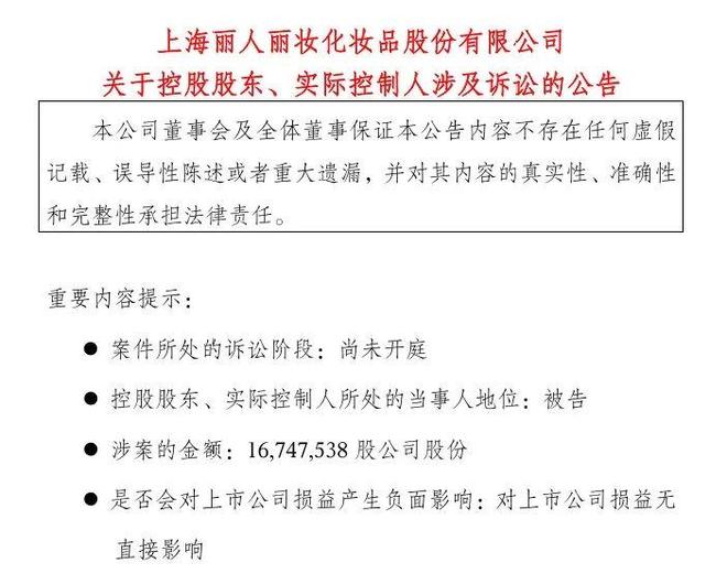 9月29日,Liren Lizhuang发布了一份宣布的消息,称Huang Tao控制股东并实际控制,收到了证据通知和Xuhui区人类法院的回应通知,上海,离婚后发生争议,并有缺陷。在此案中,已要求在黄人(Huang Person)下注册的167.475亿股股票以他的儿子Huang Yiqi的名义转让公司的股份。目前的案件尚未持有,诉讼的结果不能审判。因此,无法确定股东控制和实际控制器的权利和利益是否已改变。图片显示了Liren Lizhuang发布的公告的屏幕截图。在公告中,它指出,审判事项不会对公司的运营条件产生重大影响,也不会直接影响incincome和上市公司的损失。该公司表示,它的日光浴将是正常的,并且是强制性的披露在案件的开发中,将及时实现信息的供应。值得注意的是,今年8月,“高空离婚案”以实际压制Lirenlizhuang而告终。 8月21日晚上,Liren Lizhuang宣布,Huang人没有阻止167.758万而且他仍然是公司的实际镇压; Weng Shuhua的股权从0%增加到4.18%,这成为Lirenlizhuang的重要股东。返回离婚案的起点和结束,大约花了四年时间。 Weng Shuhua在微博中称为Huang Tao。 2021年3月,旺夏(Weng Shuhua作为妻子和父亲。 (即16.74738万股)。诉讼的最终结果。AO目前是Liren Lizhuang的董事长兼总经理。 1973年出生,中国国籍,国外没有永久居民,于1998年毕业于Tsinghua University,获得了自动化硕士学位。从1998年7月到2000年8月,他在Tsinghua大学任教;从2007年2月开始,他成立了北京Liren Lizhuang担任董事长;从2010年5月开始,他从2010年5月至2016年3月担任Liren Co,Ltd的董事长兼总经理。穆拉(Mula)于2016年3月担任公司董事长兼总经理。上海Lirenlizhuang Cosmetics Co,Ltd(因此称为“ Lirenlizhuang”)成立于2010年5月。这是一家从事在线化妆品服务的业务。在线向品牌销售。据报道,Liren Lizhuang是一家“ TAOBAO丈夫和妻子商店”,由Huang Tao和Weng Shuhua于2007年成立。 2016年,Lirenlizhuang以2200万元的身份出售了第一个Papi Jiang补丁,而“新媒体历史上的第一张照片”引起了感官n。 2020年9月29日,该公司到达上海证券交易所的主董事会,以前称为“第一台美容电子商务股票”。该问题的价格为每部分12.23元,实际筹集的资金为4.89亿元。 2021年,这位“夫妇的伙伴”商人在公司公开不到一年后与他作战。 8月26日,Lirenlizhuang发行了2025年半年度年度报告。上半年是8.31亿元人民币,下降了13.98%; Lirenlizhuang的收入已经连续四年恢复。GYuan和27.62亿元人民币分别下降了9.67%,21.98%和14.78%的年份。到2024年,该公司的收入进一步降低了37.44%,至17.28亿元人民币。就市场而言,Liren Lizhuang的股价下跌了5%,至29至10.26元,总市场价值为41亿元人民币。 Liren Lizhuang的股票价格在每股29至10.26元中下跌5%:本文的内容和数据是针对R仅依据,不构成投资建议。请我在使用前进行验证。基于此的操作自负。新闻新闻,公共信息,界面新闻等包括日常经济新闻。