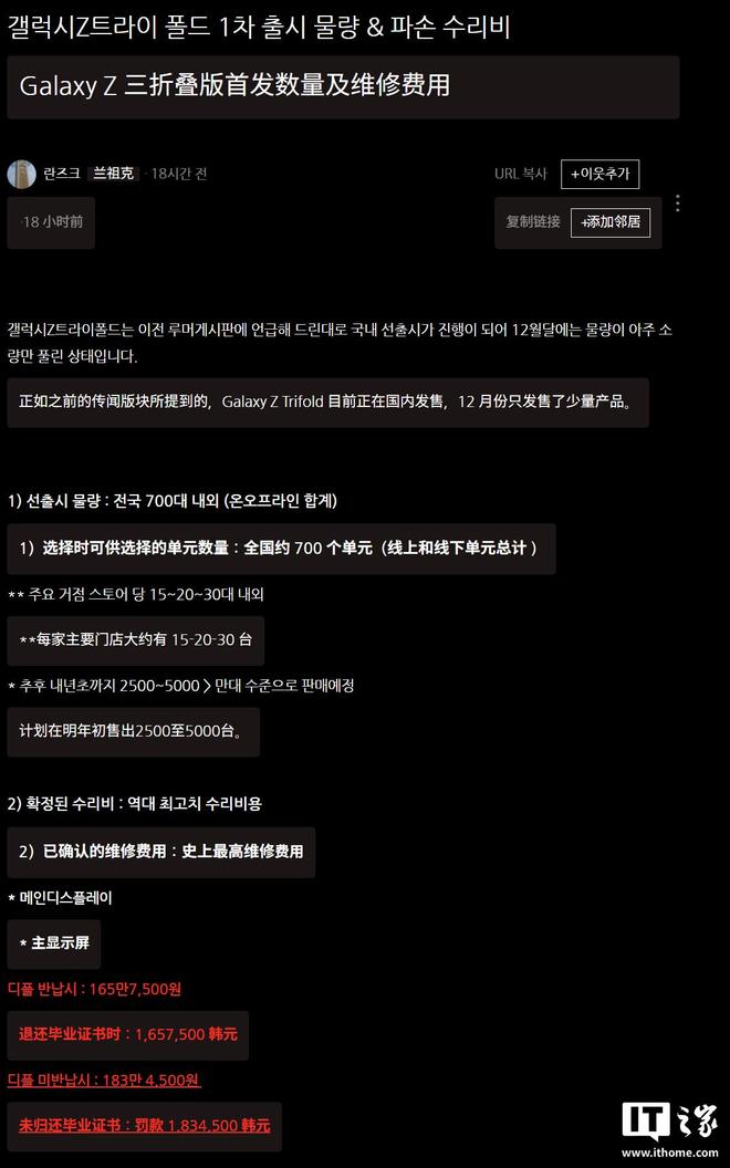 IT之家12月13日报道 消息人士 Lanjeukeu 昨天在 Naver 论坛上发帖,透露了三星 Galaxy Z Trifold 三折手机的维修价格。据消息人士透露,在韩国修复这款手机屏幕的内部成本不到1,657,500韩元(IT注:当前汇率约为7,943元人民币),使其成为三星历史上最昂贵的折叠手机内部屏幕。不过,考虑到三折手机结构复杂,如此高的价格也就不足为奇了。但好消息是,三星将为购买 Galaxy Z Trifold 的用户提供 50% 的屏幕维修折扣。至少对于用户来说,这意味着如果内屏第一次损坏,日野就需要“掏钱包”。相比之下,这款手机外屏的维修价格更加实惠,只需13.7万韩元(按当前汇率约合656.5元人民币),是手机价格的很多倍。他的内部屏幕。