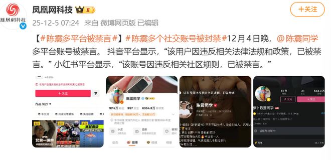 点击上方↑“电动智家”关注,记得加☆“星”!据电动智家新闻报道,12月4日深夜至12月5日凌晨,知名汽车评论员陈真在各大社交平台的账号突然被大规模封禁。其中,微博、抖音、快手、小红书平台均显示用户因违反相关法律法规或社区规则而被封禁,而哔哩哔哩的账号则直接被封禁。陈真是自行车界的顶级名人之一,拥有超过2400万的网络粉丝。这种多平台的统一封禁,在汽车自媒体领域并不多见。 “陈真被多个平台封禁”迅速成为微博热门话题。网友猜测,此次事件的主要触发点可能与陈真此前发布的一条消息有关。 12月4日,陈真发布视频《卖天山红薯的哥哥败了》“7000份法律诉讼”,被广泛解读为暗指小米。面对质疑,他辩称“他以为7000份法律诉讼是部门名称”。但公开数据显示,全球领先企业的法务人员不到2000人(例如摩根大通有1100人)。2025年小米的法务团队只有150人左右。这一说法是陈真是中国汽车媒体行业极具影响力的人物,拥有多年主持汽车评论视频的经验,他创办的《胡萝卜报告》、《真真有词》、《胡萝卜实验室》等多个知名汽车节目,2025年8月23日,陈真的微博粉丝数超标。突破1000万大关,成为汽车领域第一个实现这一目标的微博博主他的里程碑。作为汽车评论行业的顶尖领军人物,陈真的评论视频涵盖数百个品牌车型,主持风格多样,在汽车爱好者中拥有广泛的影响力。陈真被多个平台封禁并非孤立事件。他最近陷入了很多争议。最受关注的是10月3日发生的一起交通事故。当天下午,陈阵的劳斯莱斯闪亮轿车在北京万寿路附近发生严重碰撞事故。车身严重受损,安全气囊展开。北京交警通报,陈某对此次事故负全部责任。 10月18日,陈真接受《法治日报》专访,讲述了事故经过:他过于依赖车辆的辅助功能,开车时低头拾取物品,导致事故发生。就在上个月,陈真再次因评论小米而陷入困境。捐款。 11月27日,小米慈善基金会宣布捐赠1000万港元,助力香港大埔消防救援。陈真转发相关消息并评论道:“Hiit无所谓什么原因,这件事本身也不错,就像这样~”一句“不管什么原因”引起了部分网友的不满,质疑其表现出“阴阳怪异”和节奏嫌疑。当天晚些时候,陈真发表道歉声明,承认“第一条微博表述不清,深表歉意”。作为拥有千万粉丝的公众人物,他的评论具有广泛的范围和影响力,平台对其内容的管理也一直严格。多个平台同时采取封禁措施的情况并不多见,显示出平台对于一些可能违规的内容的容忍度较低。目前,各平台尚未公布陈氏禁振的具体原因和持续时间。汽车领域自媒体面临前所未有的内容监管环境。截至发稿,陈真尚未就此事发表公开声明。各大平台均未详细说明禁令的具体原因。此次全网禁令是在内容管理日益严格的背景下发生的。这不仅关系到一位汽车评论领军人物的个人命运,也关系到汽车自媒体内容创作边界重新定义的回归。