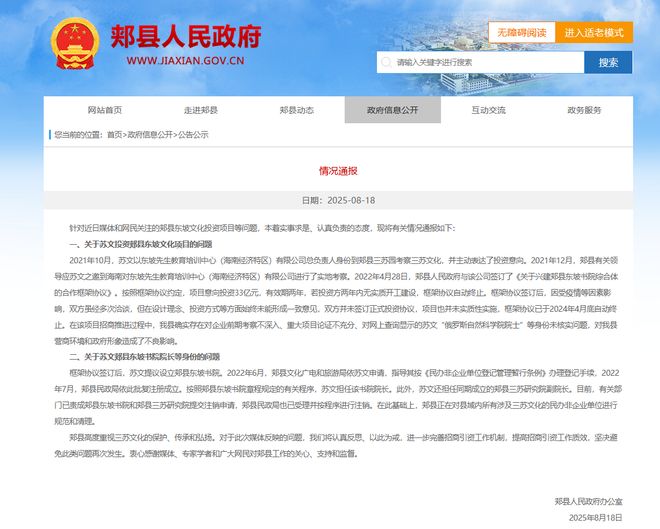 图片显示了官方网站的屏幕截图。关于媒体和网民最近关注的贾亚西亚县的dongpo文化投资问题,以一种现实,认真和负责任的态度,相关情况如下:1。关于苏·温(Su Wen)在贾克西亚县(Dongpo)文化项目中投资的问题。 2021年10月,苏恩(Su Wen)去了贾克西安(Sansu Garden),吉亚克西安(Sansu Garden)担任G. dongpo教育与培训中心(Hainan Special Evanica)有限公司的总经理,以调查Sansu文化,并积极地表达了他的投资意图。 2021年12月,苏县领导人受苏恩(Su Wen)邀请海南(Hainan)进行现场检查,对G. dongpo教育与培训中心(Hainan Propacistor Enagance Zone)有限公司(Hainan Propacistor Enage)有限公司(Hainan Procecun Enage)有限公司进行了邀请,2022年4月28日,吉亚县人民政府在建设贾亚县的Dongpo Academy中,签署了“合作框架协议,他们都不同意。ET得出了设计概念,投资方法等的结论。苏维埃的身份“俄罗斯自然科学学院的阿卡德血管”在线查询中显示,对我们县政府县“形象”形象产生了负面影响。根据Su Wen的申请,县,广播,电影和旅游局被指导根据“临时注册和私人非企业单位的管理”进行注册方法。 Su Wen在Jia County的Dongpo Academy Charter中设定的方法曾担任Jia County的学术校长。目前,相关部门已命令贾县东港学院和贾县Sansu研究所提交取消申请,而贾县民事事务局也接受了它并根据方法取消了它。在此基础上,贾县是所有涉及sansu文化的私人非企业单位的标准和清洁y。贾县非常重视Sansu文化保护,遗产和进步。关于媒体目前提出的问题,我们将认真反映它们,并将其视为进一步改善工作促进机制,提高投资促进质量和效率的警告,并确定将再次发生的问题。我衷心感谢媒体,专家,学者和网民的纪念,支持和管理jiaxian的作品。贾县人民政府办公室2025年8月18日来源:贾县人民政府