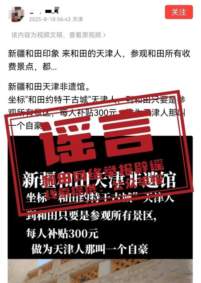 最近,一个网民在在线平台上发布:“如果天津的人们参观了所有美丽的地方,每个人将获得300元的补贴。”在验证了Hotan地区文化和旅游局之后,信息内容不正确。根据Hotan地区文化和旅游局的相关政策:在2025年,“新疆是一个不错的地方”,“ Xinjiang的展示主题无人认领的文化,不收取任何门票来进入Yotegan Old City风景秀丽的地区,并且该条目是由保留,自由和代码验证进行的。北京,天津,安海(Anhui)和吉安格(Zhejiang)的人们持有新疆援助守则,并免费进入HIT的所有A级旅游景点。网民们在网民上发布了“有300元的补贴可以参观霍丹风景区域”(照片由Hotan地区文化和旅游局提供)。互联网信息,文化和旅游部门将真诚地提醒公众:请保持警惕,不要看不见相信并传播未指定的信息。公共安全器官将认真调查和惩罚谣言,这些谣言会干扰公共秩序,并根据法律对社会产生不利影响。资料来源:“ Hotian Internet报告和反驳谣言”微信官方帐户(资料来源:新疆互联网反驳谣言)
