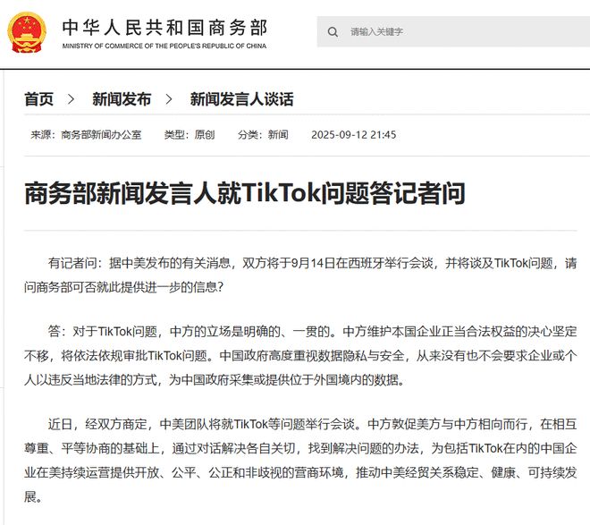 记者问:根据中国和美国发布的消息,双方将在9月14日进行西班牙对话,并讨论Tiktok问题。商务部可以提供有关它的其他信息吗?答:中国在提克托克问题上的立场是清晰而统一的。中国没有注意到其自己的企业的合法权利和利益,而是根据法律批准提克托克问题。中国政府非常重视数据的隐私和安全性,永远也不会要求公司或个人以违反当地法律的方式收集或提供中国政府的数据。最近,在双方达成协议之后,中国和美国团队将就Ng Tiktok等问题进行对话。中国鼓励美国基于彼此的尊重和平等咨询,通过对话解决他们的关注,找到解决方案解决这个问题,并为包括Tiktok在内的中国公司提供一个开放,公正,公正和未发现的商业环境,以继续运营美国,并维护中国经济经济和贸易的稳定,健康和维护。网站屏幕截图